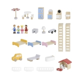 U kompletu je 32 elemenata: namještaj za kuhinju, dnevni boravak, kupaonicu, spavaću sobu i dječju sobu, 4 figurice i psić.