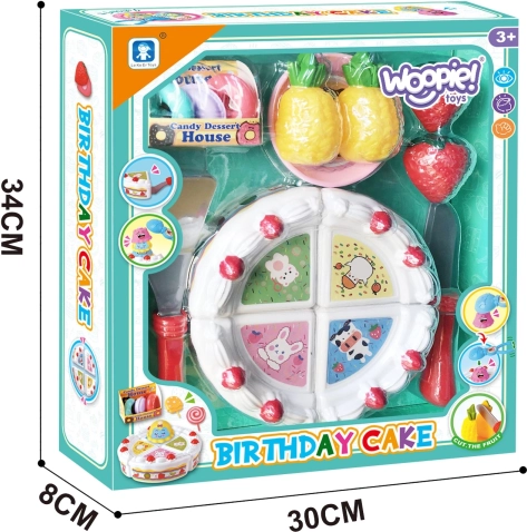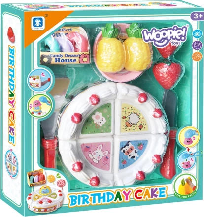 Dječji set Woopie s tortom, voćem i slatkišima za rezanje donosi sate kreativne igre. Djeca mogu prirediti rođendansku proslavu, rezati tortu na kriške i poslužiti uz pomoć pribora. Potiče razvoj fine motorike i igranje uloga već od 3 godine.