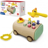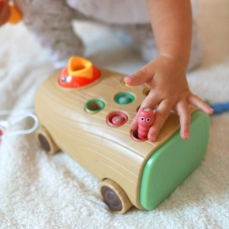 Ova interaktivna igračka raste s djetetom: od prvih koraka kao vučna količka s glatkim hodom, preko zabijanja crvića sigurnim čekićem, do magnetskog lovljenja skrivenih dijelova uz pomoć ptičice s magnetom. Potiče koncentraciju, strpljenje i razvoj osjetilnog doživljaja.
