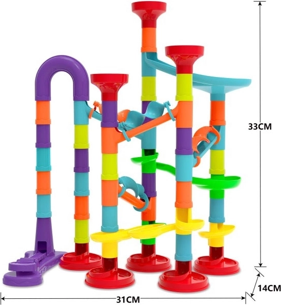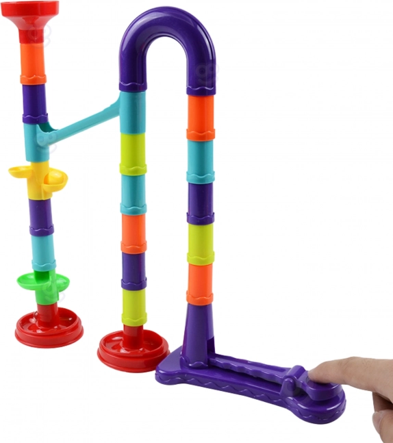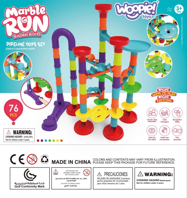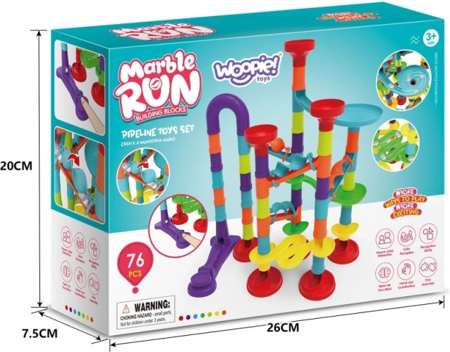 Kreativni građevni set staze za kuglice WOOPIE idealna je igračka za znatiželjnu djecu. Zahvaljujući živim bojama i raznim oblicima cijevi, lijevaka i zavoja, djeca lako slažu vlastite originalne staze i promatraju kako kuglice jure jedna za drugom.