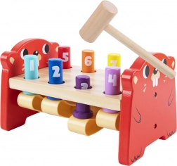 Set sadrži drvenu klupu s 8 šarenih kolčića i drveni čekić. Igračka je izrađena od sigurnih i izdržljivih materijala, koji osiguravaju maksimalnu sigurnost i dugotrajnost.