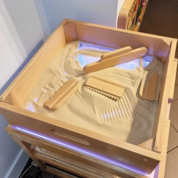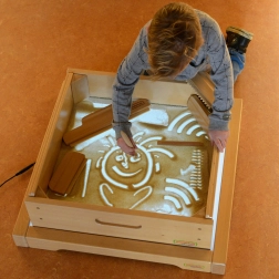 Za još snažniji dojam okvir se može nadopuniti opcionalnom LED svjetlosnom pločom koja se napaja preko Micro USB i praktično upravlja daljinskim upravljačem. Ploča omogućuje podešavanje komponenti RGB (crvena, zelena, plava) i odabir 3 režima: petlja duginih boja, efekt oluje s munjama i petlja umirujućih boja. Ploča je dizajnirana da se slaže s multifunkcionalnim Masterkidz stolićem na kotačićima.