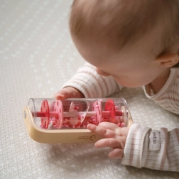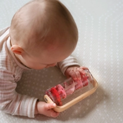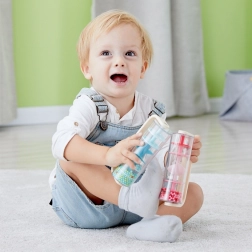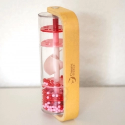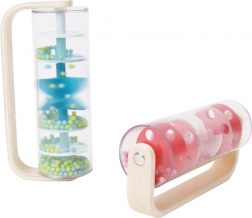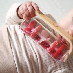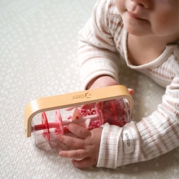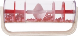 Ova crvena kišna palica spaja prirodno drvo i prozirno tijelo puno kuglica koje se pri pokretu glatko presipavaju i stvaraju opuštajući, ritmičan zvuk. Djeca igračkom mogu tresti, okretati je za 360° i promatrati kako perlice putuju s gornjeg dijela prema dolje – izvrstan poticaj za vid, sluh i finu motoriku.