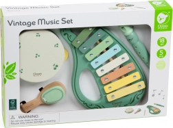 Ovaj stilski set u vintage izvedbi sadrži sve što maloj djeci treba za otkrivanje svijeta zvukova: cimbalčiće (ksilofon), tamburin, blokflautu/rekorder, kastanjetu i batić. Zahvaljujući spoju drva i metala instrumenti imaju ugodan zvuk i podnose svakodnevno sviranje.
