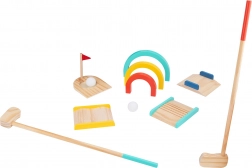 Drvena sportska igra golf od Tooky Toy klasična je igra za dva igrača, idealna za aktivno provođenje slobodnog vremena. Ova igra pomaže razvijati koncentraciju, reflekse, spretnost i preciznost. Izrađena je od 100% netoksičnog i vremenski otpornog drva. Prikladna je za cijelu obitelj te se može igrati i u vrtu i kod kuće zahvaljujući lako sklopivoj rupi.