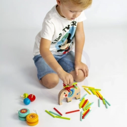 Ovaj raznolik drveni set od 46 dijelova spaja nekoliko omiljenih igara u jednom pakiranju. Djeca mogu balansirati štapiće na leđima slona, slagati toranj ili bunar, igrati mikado, vježbati trikove s dva jo-joa i uspoređivati čiji će se zvrk dulje vrtjeti. Idealno za samostalnu igru i obiteljsko natjecanje.
