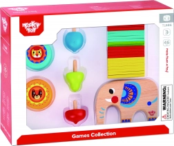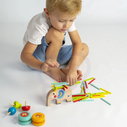 Otkrijte svestrani drveni set igara brenda TOOKY TOY koji će djeci donijeti sate kreativne zabave. Šarmantni slon služi kao baza za slaganje, šarene štapiće iskoristit ćete za mikado, a u setu su i dva jo-joa te zvrk. Igra potiče finu motoriku, koordinacijske vještine i strpljenje, izrađena je od sigurnih i netoksičnih materijala te odlično razvija logičko razmišljanje.
