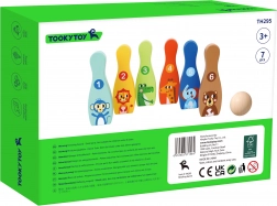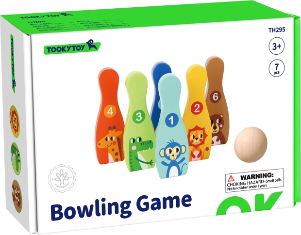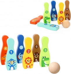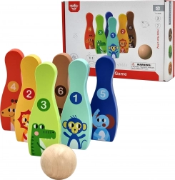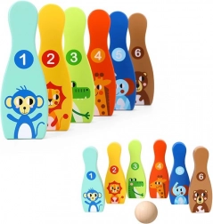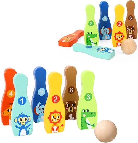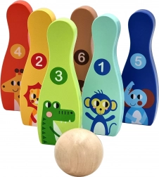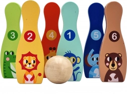 Drveni bowling set sa šest šarenih kugli i lopticom idealna je igra za dječju sobu. Svaka kugla ima životinjski motiv i označavanje 1–6, zahvaljujući čemu djeca tijekom igre prirodno vježbaju brojanje, prepoznavanje boja i razvijaju motoričke vještine.