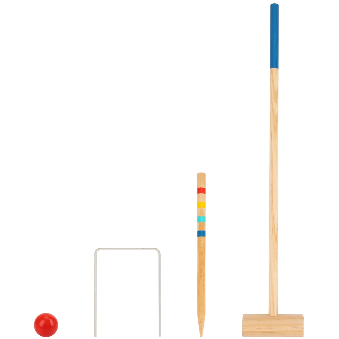 U pakiranju se nalazi 4 drvene palice, 4 šarene loptice, 6 metalnih obruča, 4 završna kolčića i torba – sve spremno za trenutnu igru.