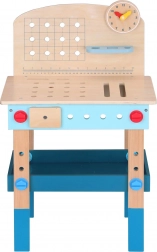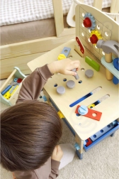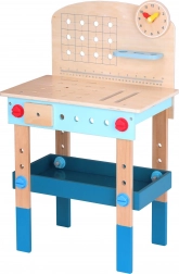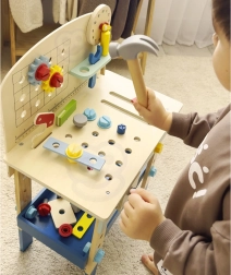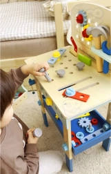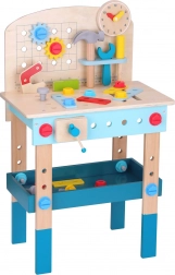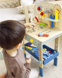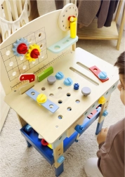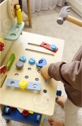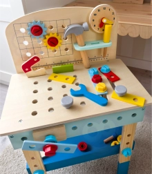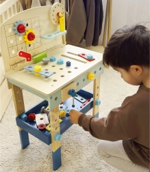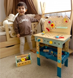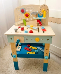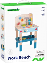 Drveni radni stol brenda Tooky Toy ispunjenje je sna svakog malog majstora. Set sadrži stolić zajedno s raznim igračkama-alatima: pilicom, čekićem, ključem, odvijačem, stegom, mjerilom, vijcima, maticama, podloškama i zupčanicima. Zahvaljujući policama i držačima na stolu djeca će imati sve potrebno nadohvat ruke, a dijelovi seta mogu se pričvrstiti na stolić. Igračka je sigurno dizajnirana za djecu, rubovi i bridovi su zaobljeni kako bi se spriječile ozljede.