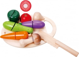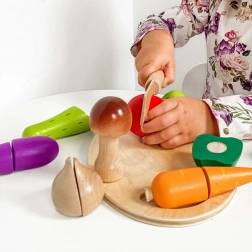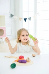 Ovaj drveni set za rezanje povrća brenda CLASSIC WORLD idealan je za male kuhare koji vole oponašati svijet odraslih. Dijelovi povrća povezani su čičkom pa ih djeca mogu „rezati“ drvenim nožićem i ponovno spajati – zabavno, sigurno i edukativno.
