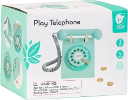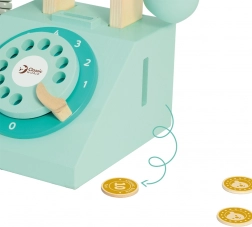 Ovaj drveni telefon u klasičnom stilu donosi djeci autentičan doživljaj igre. Zahvaljujući okret nom brojčaniku, slušalici na užetu i igri s ubacivanjem novčića djeca uče voditi razgovor, razvijaju socijalne vještine i vježbaju koordinaciju oko–ruka. Bez baterija – oglašava se ugodno mehaničko zvonce.