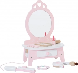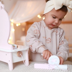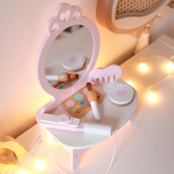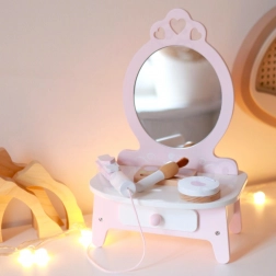 Ova prekrasna dječja toaletka u ružičastoj boji opremljena je ogledalom i 11 raznih dodataka, uključujući češalj, ruž, peglu za kosu, pudrijeru i još mnogo toga. Svi dodaci su izrađeni od kvalitetnog drva, a njihov dizajn u pastelima daje igrački čaroban izgled. Toaletka nudi dovoljno prostora za pohranu svih tajnih kozmetičkih trikova vaše male manekenke.