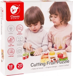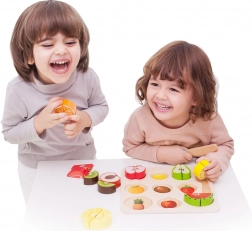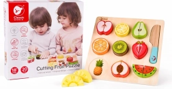 Set sadrži 20 dijelova uključujući obostranu ploču, nožić i različito voće. Ova sigurna igračka za djecu od 18 mjeseci izrađena je od lakiranog drva i obojena netoksičnim bojama, što jamči da je potpuno sigurna za upotrebu.