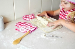 Ružičasto-bijele karirane rukavice i podložak štite male ruke od vrućih površina, što čini kuhanje sigurnim.
