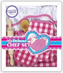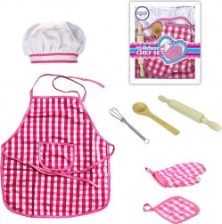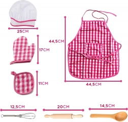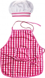 Pregača i kapa s ružičasto-bijelim kariranim uzorkom su glavni elementi koji osiguravaju stilsko i funkcionalno iskustvo igre za djecu.