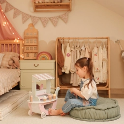 Drveni sladoledni kiosk Woopie Green nije samo prekrasan komad u nježnim pastelnim bojama, već je i pun mogućnosti za kreativnu igru. Vaše dijete može postati prodavač, kupac ili čak zmajstor sladoleda i stvarati vlastite sladoledne kupove prema svojoj mašti!