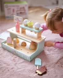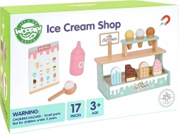 Postanite prodavač sladoleda s privlačnim drvenim štandom WOOPIE GREEN. Pastelni set od sigurnog drva nudi kornete, kuglice i sladolede na štapiću, magnetno spajanje kuglica te jelovnik za igru trgovine. Potiče finu motoriku, maštu i igru uloga.