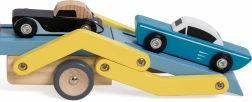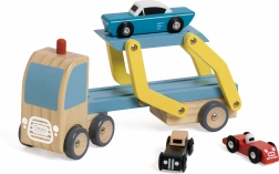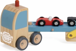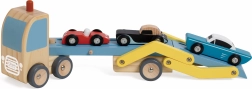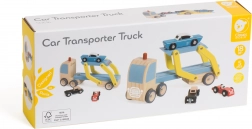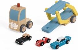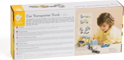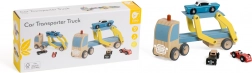 Drveni transporter automobila idealna je igračka za djecu od 18 mjeseci. Ovaj kvalitetan drveni set uključuje kamion s teretom i tri šarena vozila koja se lako mogu utovariti i istovariti.