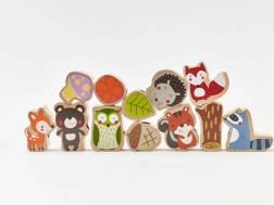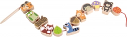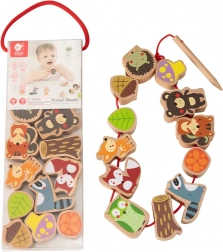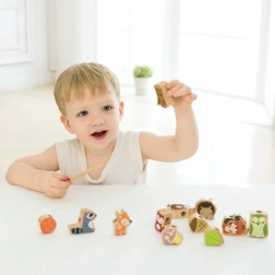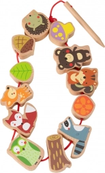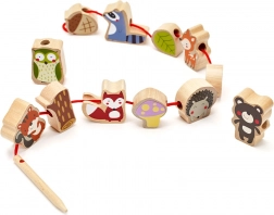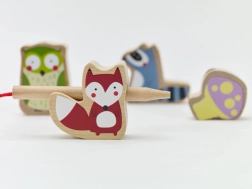 Set sadrži 12 drvenih perli i uzicu s drvenom iglom. Dijelove je moguće nizati bilo kojim redoslijedom – dijete tako uvježbava boje, oblike i nazive životinjica te istodobno stvara vlastite priče iz šume. Idealan izbor za mirnu, smislenu zabavu kod kuće i na putu.