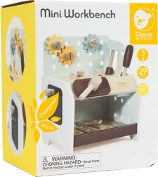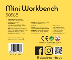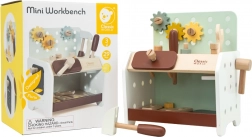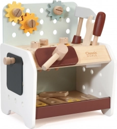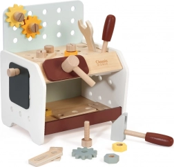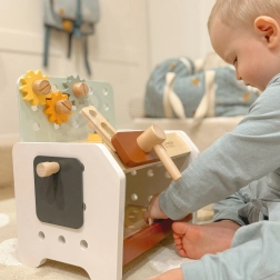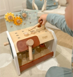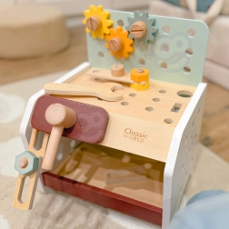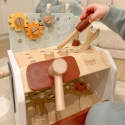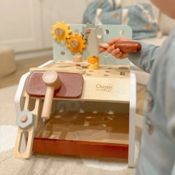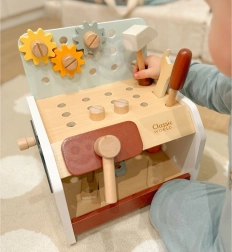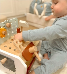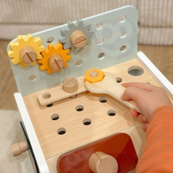 Praktični, lako prenosivi drveni radni stol za djecu nudi sve što malom majstoru treba: čekić, odvijač, ključ, vijke, matice, zupčanike i pločice s rupama. Djeca mogu bušiti, zavrtati i zakucavati, razvijati logiku i učiti principe uzroka i posljedice.