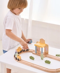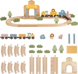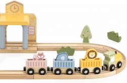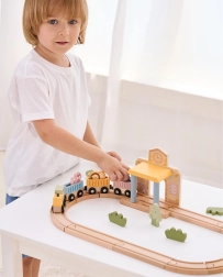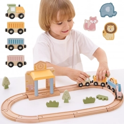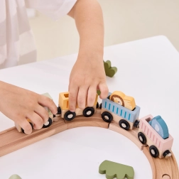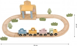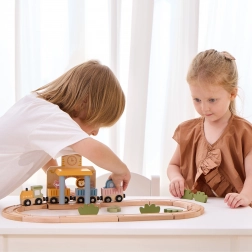 Zahvaljujući čvrstoj izradi od kvalitetnog drva, set je izdržljiv i siguran za svakodnevnu igru. Djeca razvijaju finu motoriku, koordinaciju oko–ruka i kreativnost smišljajući priče sa životinjama – slonom, lavom i lisicom. Željeznička pruga izvrsna je za samostalnu i zajedničku igru.