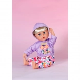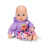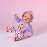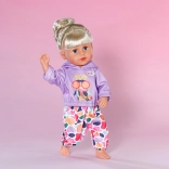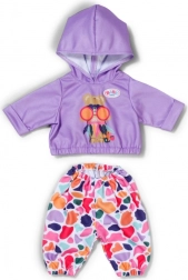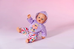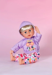 Stilski set za lutke veličine 43 cm: ljubičasta majica s kapuljačom i veselim printom usklađena je s šarenim hlačama za razigrano kombiniranje. Dio seta je i vješalica od recikliranog materijala. Odjeća potiče kreativnu igru, lako se oblači i odlično pristaje i na BABY born Teddy.