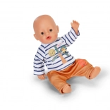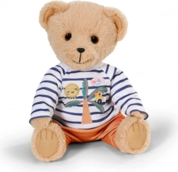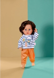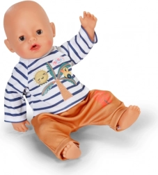 Stilizan set za lutke BABY born i medvjedića BABY born Teddy ističe se udobnošću i razigranim dizajnom. Sadrži prugastu majicu s dugim rukavima s motivom palme i sunca te narančaste hlače s tiskom. Odjeća je prikladna za lutke veličine 43 cm i zahvaljujući mekanim materijalima lako se oblači. Dio seta je i vješalica od recikliranog materijala. Idealno za kreativnu igru, lako presvlačenje i dugotrajnu zabavu.