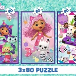 Set puzzli 3×80 dijelova donosi tri različite slike u jednom pakiranju s motivima iz omiljene serije Gabin mačji kućica. Zahvaljujući trima zasebnim slagalicama, slaganje je još zabavnije i može uključiti više djece istovremeno. Svaka gotova slika ima dimenzije 275 × 180 mm i izrađena je od kvalitetnih materijala s FSC certifikatom.