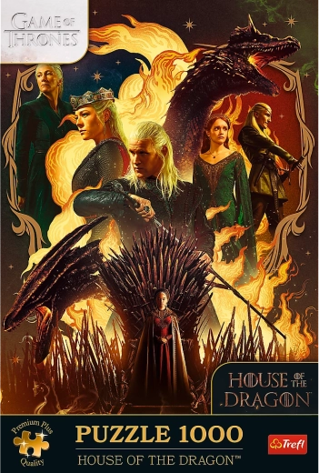 Premium puzzle TREFL Premium Plus Igra prijestolja: Zmajeva kuća, 1000 dijelova. Kvalitetan karton, precizno izrezivanje, FSC certifikat, predložak u pakiranju. Dimenzije 48 × 68,3 cm.