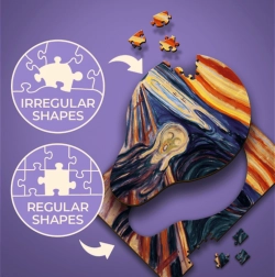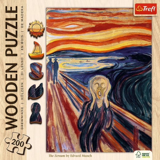 Priuštite si trenutke opuštanja s iznimnim drvenim puzzlama TREFL inspiriranima remek-djelima slikarstva. Ovo izdanje donosi slavno djelo EDVARDA MUNCHA – Krik, koje će oduševiti ljubitelje umjetnosti i zahtjevne slagatelje. Zahvaljujući preciznoj laserskoj obradi, dijelovi su čvrsti, precizni i prava je radost slagati ih.