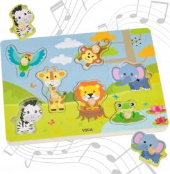 Ova interaktivna drvena slagalica s temom egzotičnih životinja idealna je za prvo upoznavanje svijeta prirode. Nakon umetanja odgovarajućeg dijela pokreće se zvuk odgovarajuće životinje, koji motivira dijete na daljnje isprobavanje i jača poveznicu između slike i zvuka.