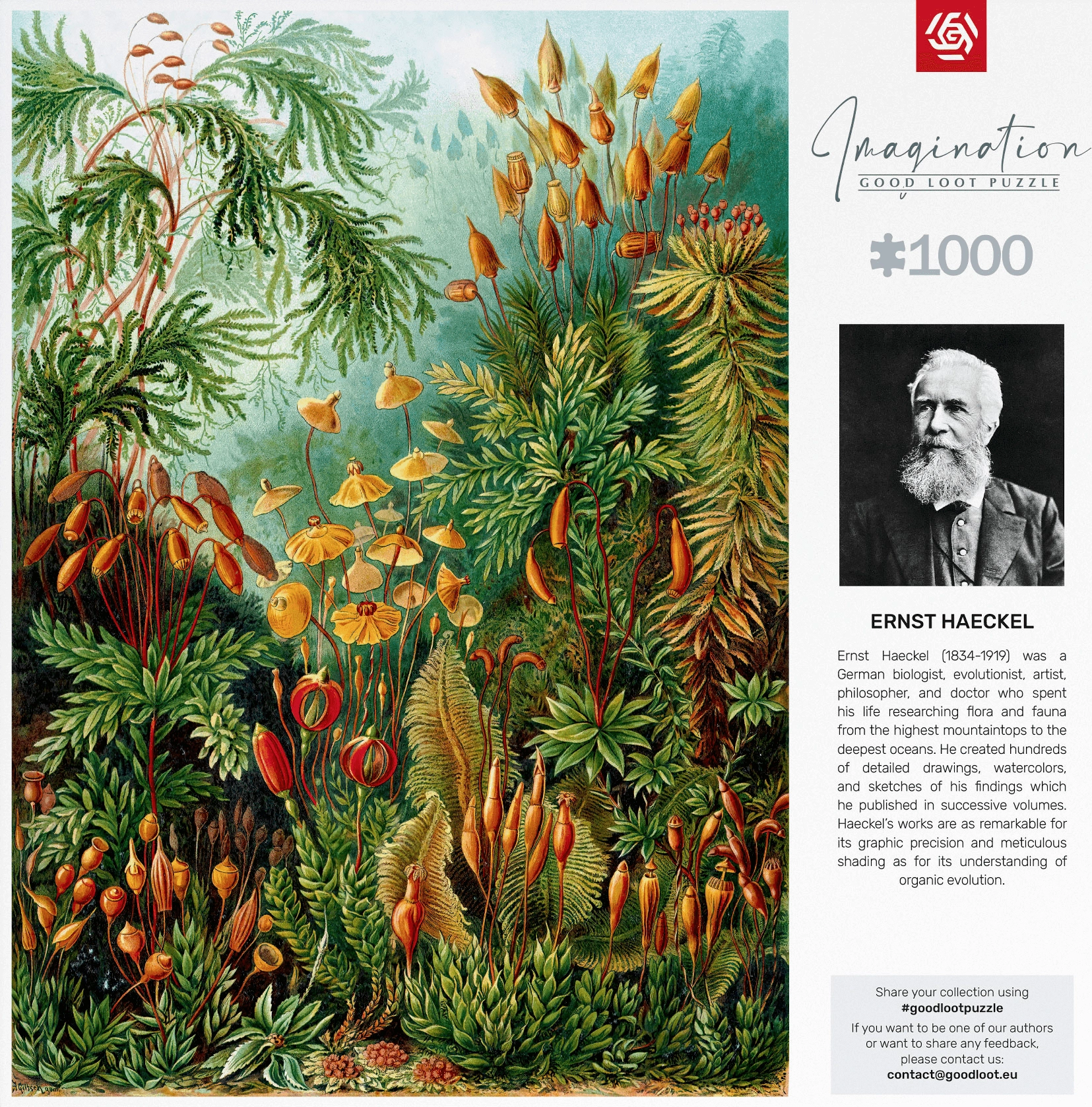 Uživajte u kreativnom izazovu s puzzlama Imagination: Ernst Haeckel - Muscinae, koje sadrže sjajnih 1000 dijelova. Nakon slaganja nastaje slika dimenzija približno 48 x 68,3 cm, koja prikazuje fascinantno djelo poznatog ilustratora Ernsta Haeckela.