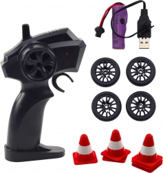 Paket sadrži daljinski upravljani auto, upravljač, USB akumulator, dodatne drift gume i set trening čunjeva.