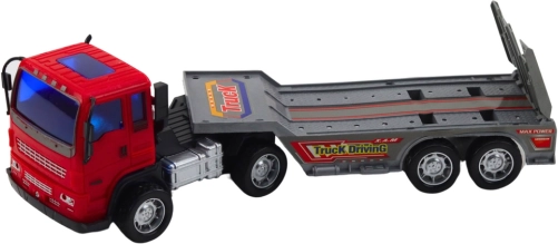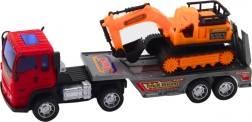 Crveni kamion s platformnom prikolicom sigurno prevozi bager – djeca mogu isprobati utovar, istovar i prijevoz kao na pravom gradilištu.