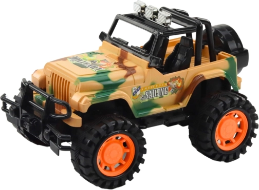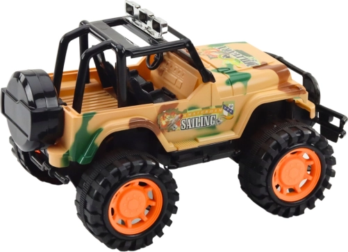 Dječji terenski auto u bež maskirnom stilu donosi puno akcije: ima povišeni podvoz, velike kotače s dubokim profilom i izdržljivu plastičnu konstrukciju za vožnju u kući i na otvorenom. Dimenzije vozila 25 × 16,5 × 15,5 cm.