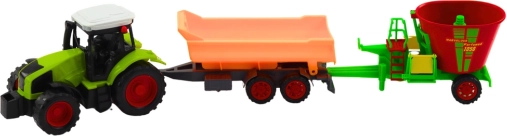- Zeleni traktor, narančasta prikolica (kipajuća), crveno‑zelena hranilica