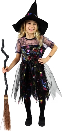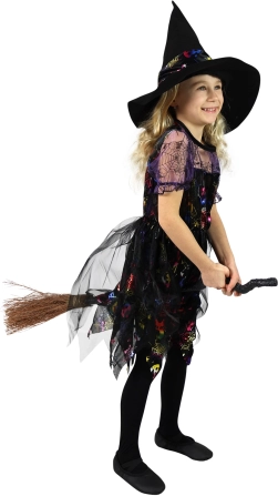 Pretvorite svoje dijete u malu vješticu s ovim zadivljujućim kostimom! Crno i šareno ukrašen kostim s vještičjim šeširom dat će svakoj djevojčici čaroban izgled.