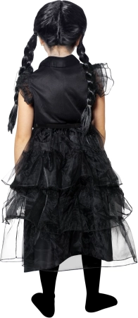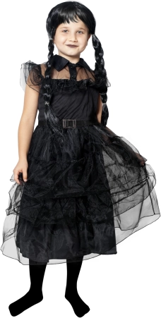 Unesite dašak tajne na karneval i Halloween s ovim dječjim kostimom: crna gotička haljina s romantičnim volanima, remenom s kopčom i elegantnim ovratnikom. Idealan za obožavateljice mračnog stila, u veličini S (4–6 godina) i za visinu 105–116 cm. Perika nije uključena u pakiranje.