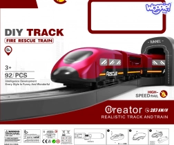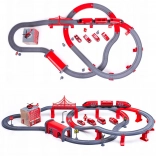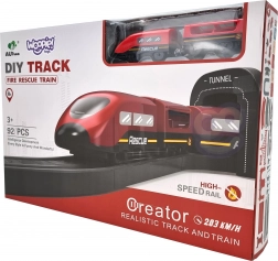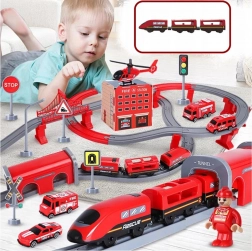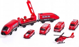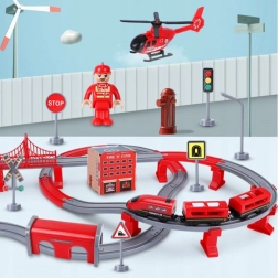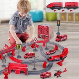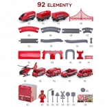 Sadržaj pakiranja: lokomotiva (2× AAA, nisu uključene), 2 vagona, 4 vatrogasna vozila, helikopter, figurica vatrogasca, remiza, most, tunel, tračnice, podupirači i prometna signalizacija. Kombinacija željeznice i cestovne spasilačke tehnike potiče koordinaciju oko–ruka, prostornu orijentaciju i narativnu igru.