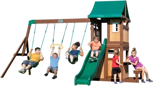 Lakewood pametno kombinira povišenu kulu s krovom, tobogan i bočno sjedenje, pa nudi mnogo aktivnosti i na manjoj površini.