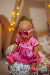 Podarite svojoj lutki novi štih s elegantnim ružičastim setom WOOPIE. Haljina s preslatkim motivom zečića, usklađene cipelice i sunčane naočale pretvaraju svaku igru u zabavnu modnu predstavu. Savršeno pristaje lutkama veličine 43–46 cm.