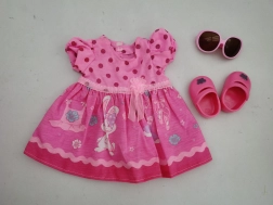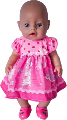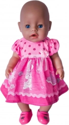 Stilna ružičasta haljinica s točkicama i motivom zečića daje lutki jedinstven izgled i potiče dječju razigranu maštu.