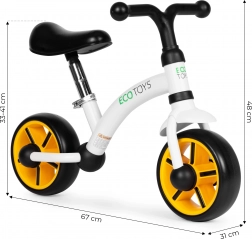 Guralo ECOTOYS odličan je izbor za prve korake prema samostalnoj vožnji. Zahvaljujući maloj težini i pametnoj konstrukciji, djeca prirodno vježbaju ravnotežu, koordinaciju i sigurnost, što olakšava prijelaz na klasični bicikl. Pješkaren i praškasto lakiran čelični okvir osigurava dug vijek trajanja i moderan izgled, EVA kotača su tiha, izdržljiva i ne zahtijevaju pumpanje.