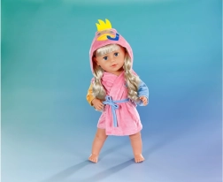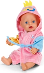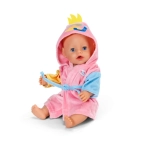 Priuštite svojoj lutki udobnost i stil nakon kupanja s ovim mekanim kućnim ogrtačem BABY born za veličinu 43 cm. Zahvaljujući kapuljači s duhovitim motivom pačića, šarenim rukavima i ugodnom materijalu, to je idealni dodatak za maštovitu igru. Ogrtač savršeno pristaje i na BABY born Teddy, a dio pakiranja je i vješalica od recikliranog materijala.