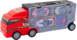 Ovaj crveni kamion s garažom i izbacivačem odličan je izbor za djecu koja vole aute, utrke i skupljanje modela. Prozirni dio poluprikolice omogućuje lako vidjeti spremljene autiće, a pretinci potiču red i samostalnost u igri.