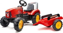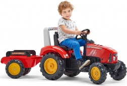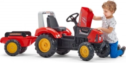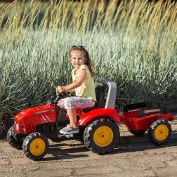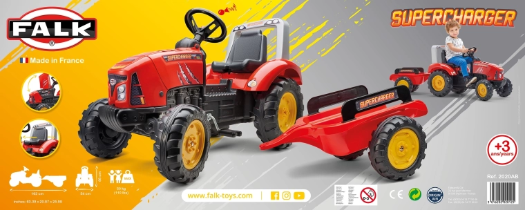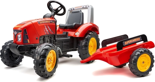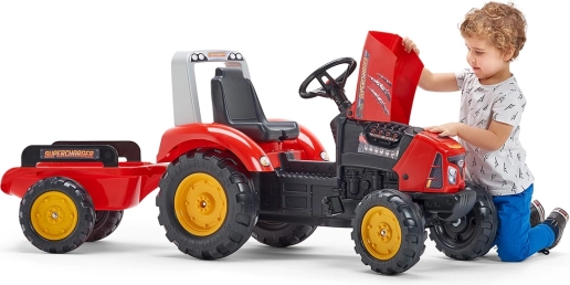 Dječji pedalni traktor s prikolicom Red Supercharger brenda FALK razveselit će svakog malog farmera. Nudi izdržljivu plastičnu konstrukciju, poklopac motora koji se otvara s imitacijom motora, trubu na upravljaču i odvojivu prikolicu. Zahvaljujući lančanom pogonu na stražnju osovinu i zakretnoj prednjoj osovini vožnja je stabilna, sigurna i zabavna.