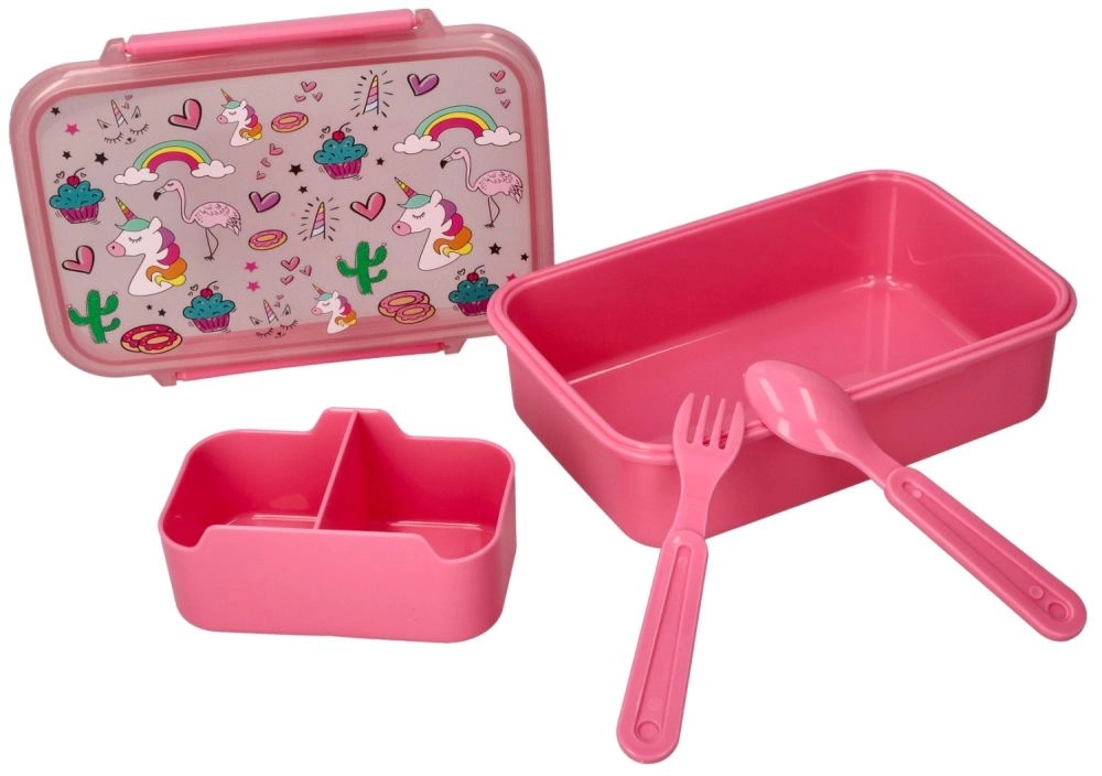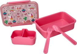 Ova dječja kutija za užinu u ružičastoj boji s veselim motivima jednoroga, duge i srdašaca idealna je za školske užine i izlete. Zahvaljujući kompaktnim dimenzijama 18 × 13 × 6 cm stane u većinu školskih ruksaka i torbi. U kompletu su i praktična žličica i vilica, tako da djeca imaju sve potrebno pri ruci.
