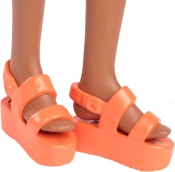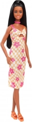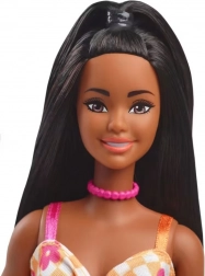 Prekrasna visoka lutka Barbie s dugom crnom kosom dijelom svezanog, ukrašena ružičastom ogrlicom i narančastim platformskim sandalama. Njezin izgled nadopunjuje elegantne haljine s cvjetnim uzorkom.