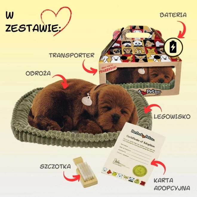 Mekani čokoladni labrador djeluje iznimno realistično – zatvorene oči, nježno krzno, ogrlica s pločicom i udoban ležaj stvaraju dojam pravog uspavanog šteneta. Igračka unosi mirnu atmosferu u dom i dječju sobu te razveseljava male i velike ljubitelje pasa.